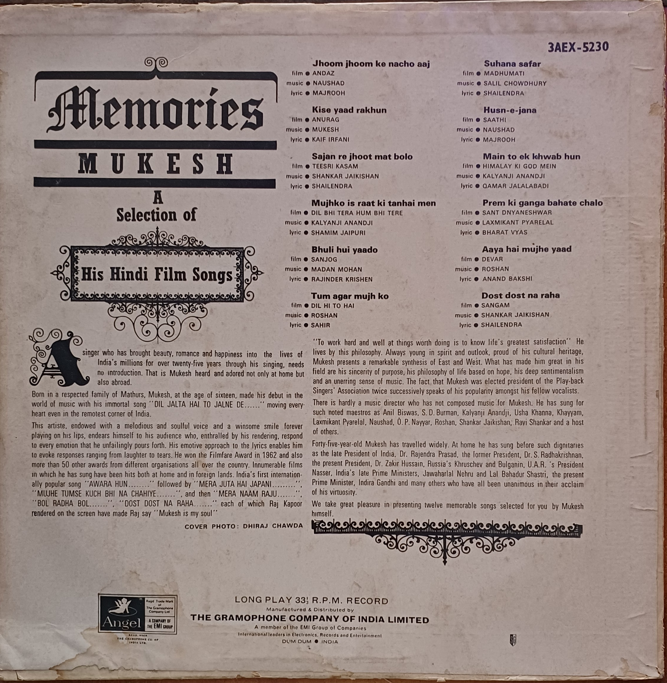 Memories Mukesh – (A Selection Of His Hindi Film Songs) Vinyl Lp Record (1969)