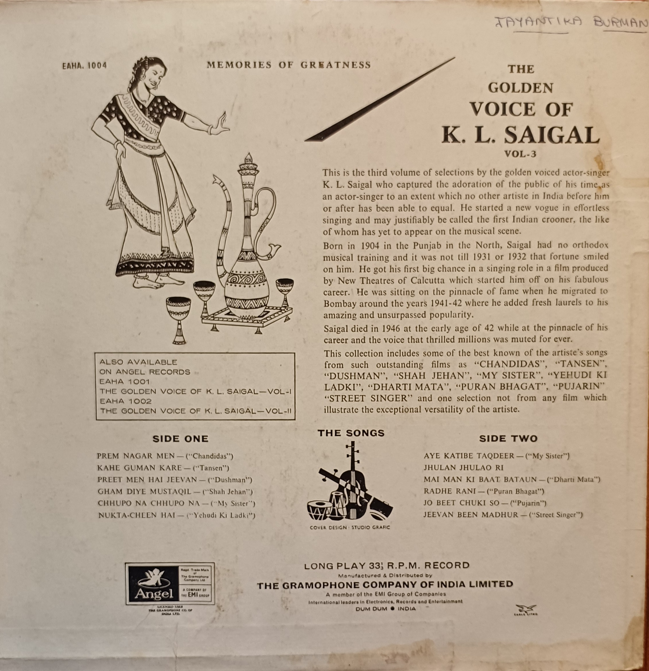 Memories Of Greatness-The Golden Voice Of KL Saigal – Vol-3 – Vinyl Lp Record (1963)